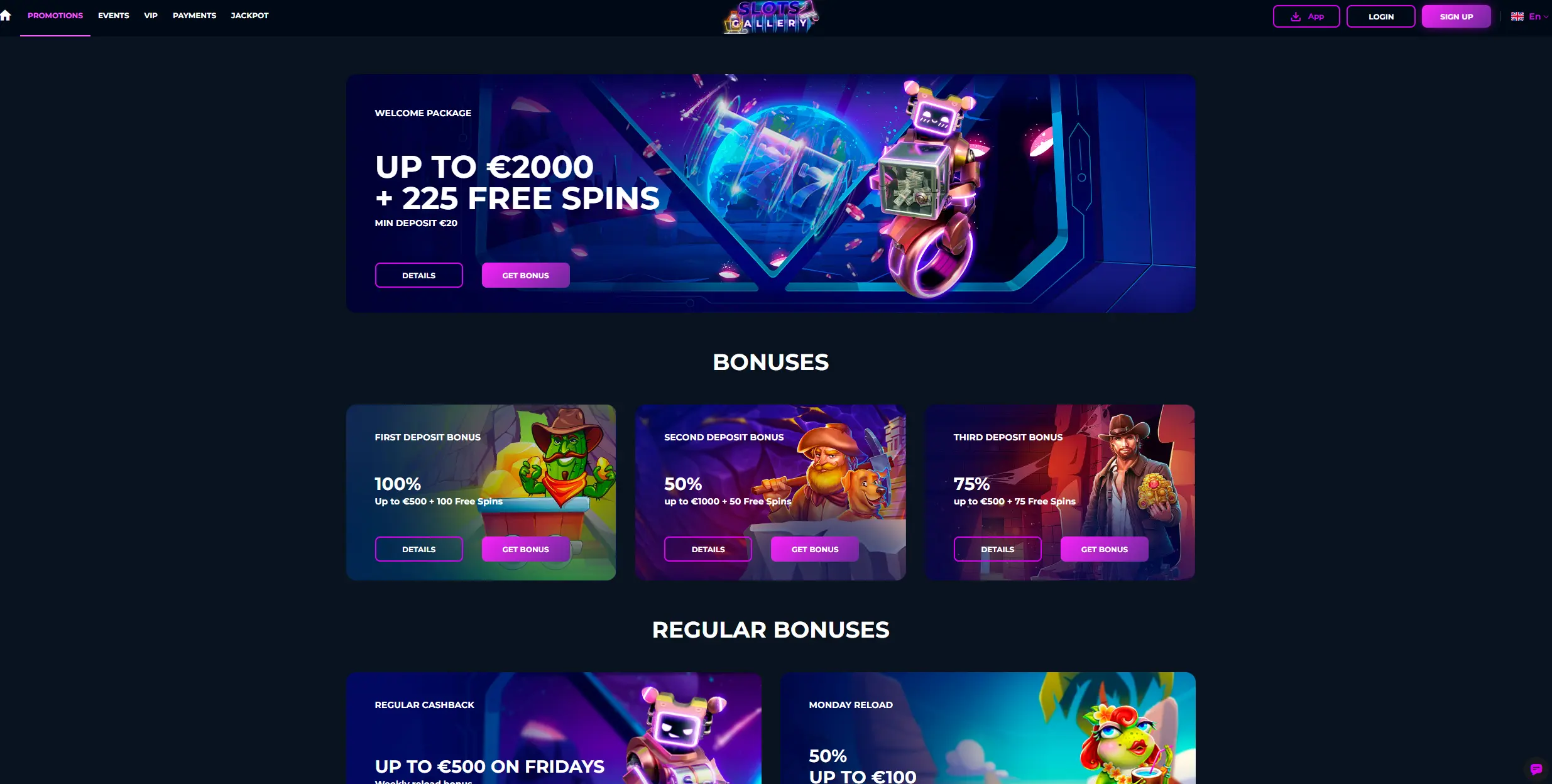 SlotsGallery Casino is a vibrant and dynamic online casino that combines a vast array of gaming options with the convenience of diverse payment methods. Licensed under the Curacao eGaming authority, it offers a secure and fair gaming environment with an artistic edge.