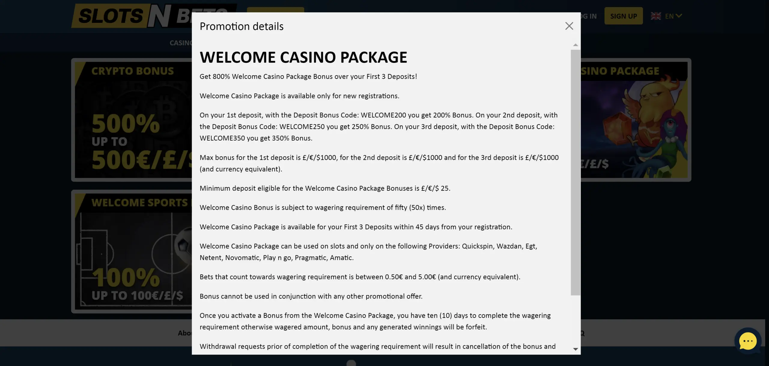 At SlotsNBets Casino, new players are welcomed with enticing bonus packages, including free spins. The casino offers an 800% bonus over your first three deposits. In the first deposit section, you can claim a 200% bonus with the code WELCOME200. Similarly, you can get a 250% bonus on your second deposit with the code WELCOME250, and a 350% bonus on your third deposit with SlotsNBets casino bonus codes WELCOME350.
