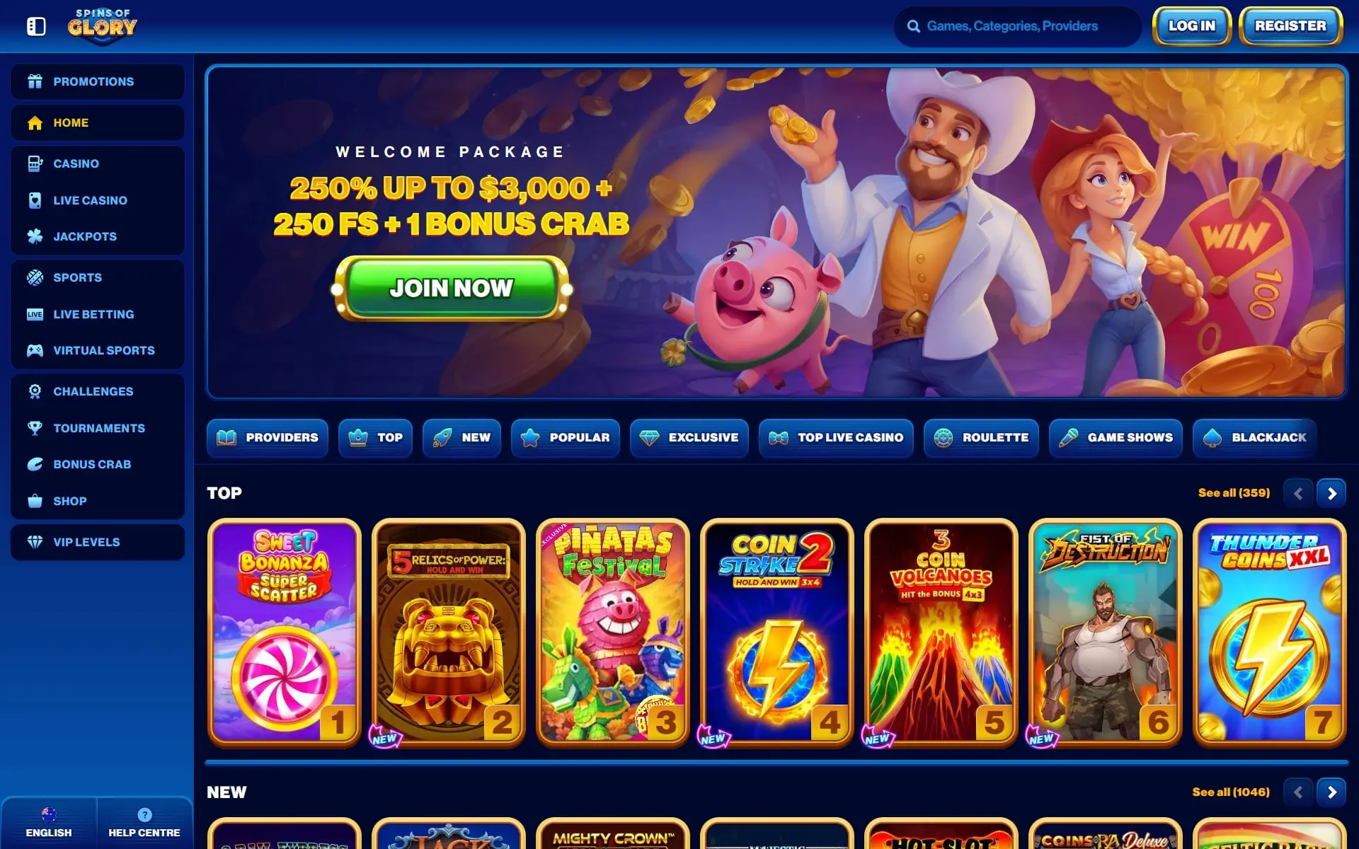 Ready for glory? Join Spins of Glory, claim up to 250% + 250 FS + Bonus Crab, and jump into thousands of slots, live tables, and in-play sports today.