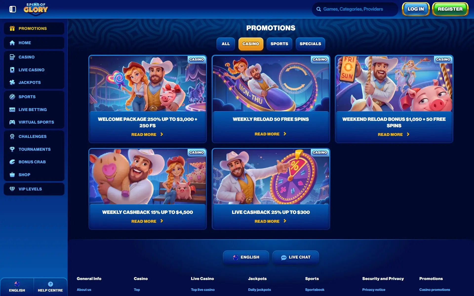 Spins of Glory is a conversion-friendly hybrid that makes sense if you want one wallet for slots + live tables + sports and a busy cadence of promos to keep you engaged. The product strength is discoverability—clear categories for RNG and live, plus quick routes into jackpots and virtuals. The promotional strength is volume and variety (welcome, weekly reloads, weekend reload, weekly & live cashbacks, seasonal networks). Overall, it earns a place on shortlists for “play a lot, switch often” users, and it’s especially attractive if you enjoy toggling between reels and weekend sports without juggling multiple accounts.