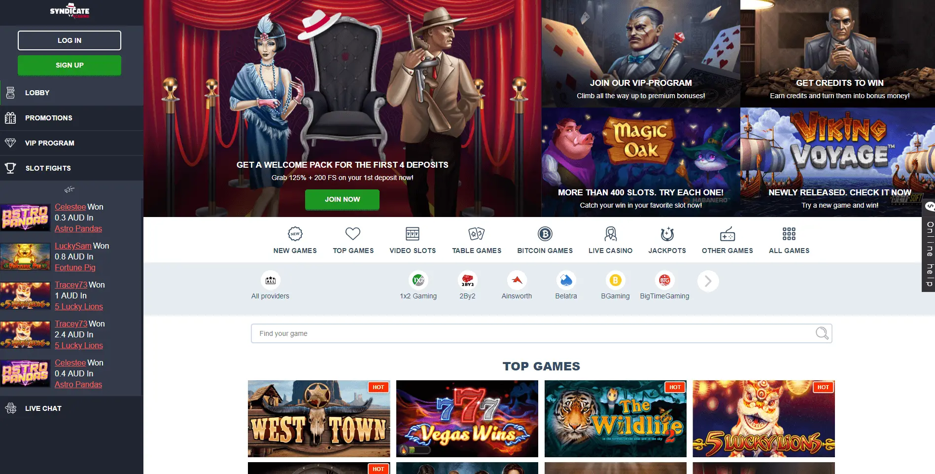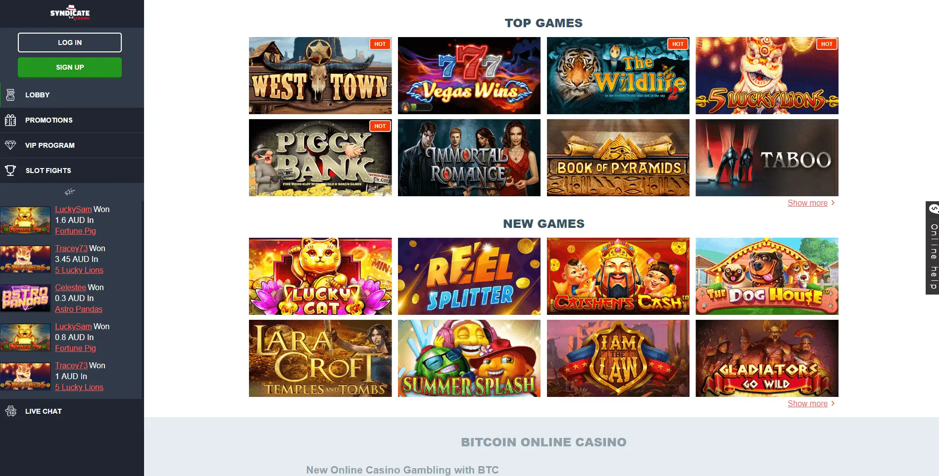 Syndicate Casino stands out as a modern casino site that accepts Bitcoin payments, offers generous bonuses and programs, provides fast withdrawals, and delivers seamless gameplay across all devices without any issues, delays, or lags. Be sure to claim your bonus and try Syndicate Casino today!