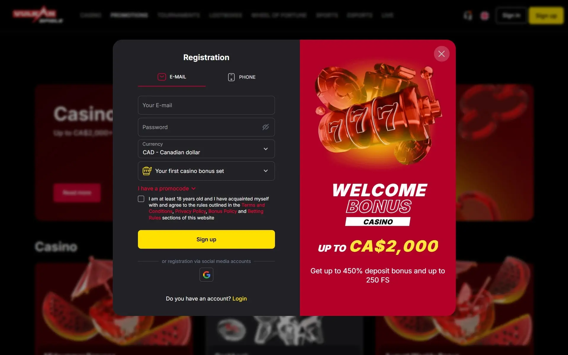 VulkanSpiele advertises a headline casino package up to 450% and 250 Free Spins (up to €2,000 in total), plus a 100% sports welcome for bettors. A no-deposit bonus is marked as available. The exact structure (deposit steps, free-spin batches, eligible games) can change, so check the Promotions page and bonus T&Cs in the cashier before you play.